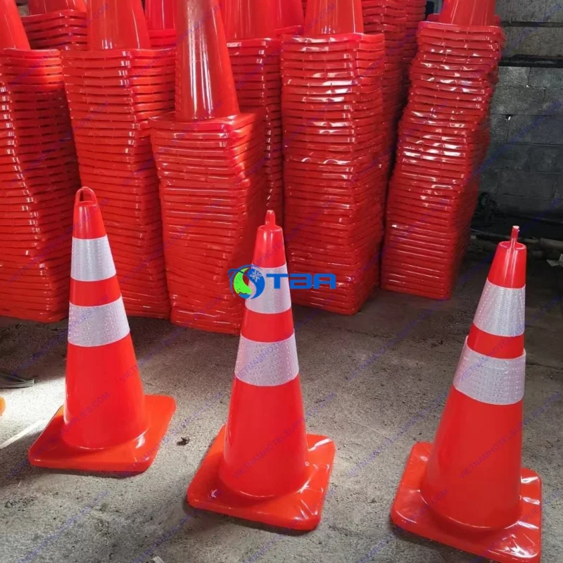 Chiều cao 68cm cùng phần đế rộng 33cm giúp tăng độ ổn định khi đặt trên mặt đường. Màu sắc cam kết hợp dải phản quang trắng nổi bật, dễ dàng nhận biết từ xa cả ngày lẫn đêm.