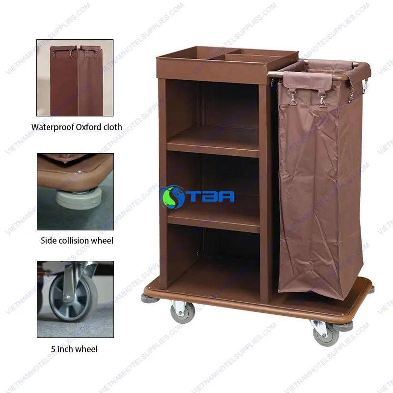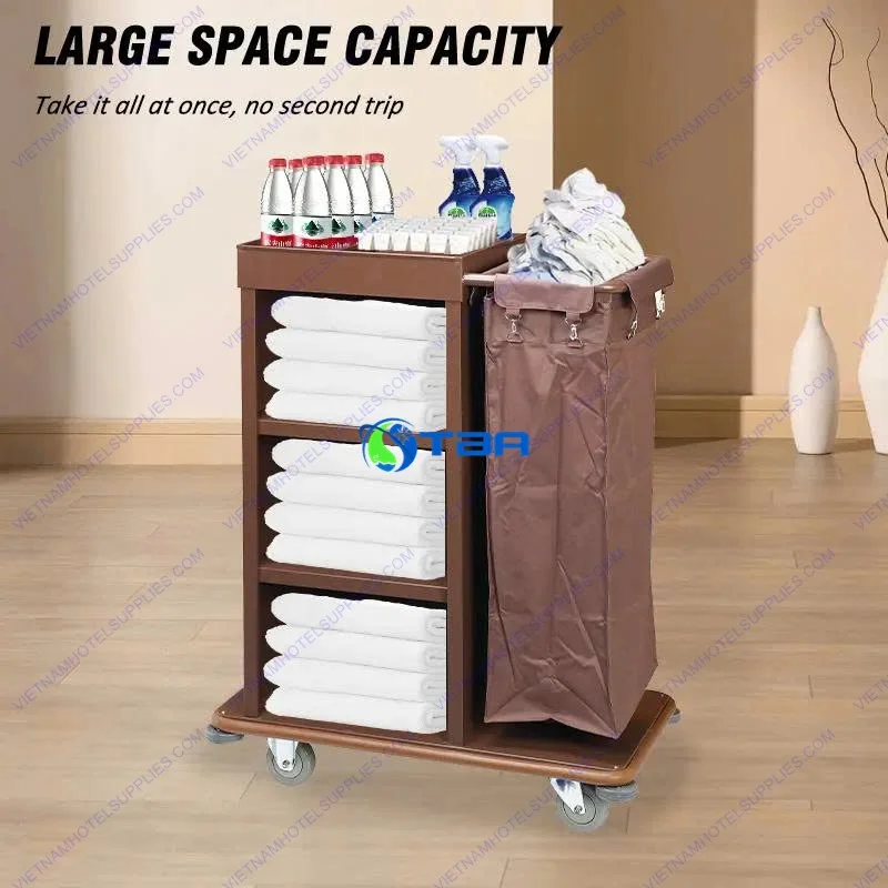 Xe làm vệ sinh buồng phòng ba tầng túi đơn hay còn gọi xe dọn buồng phòng khách sạn ba tầng 1 túi có thiết kế thông minh tện dụng giúp để được nhiều đồ dễ dàng phân loại đồ sạch và dơ riêng biệt, là trợ thủ đắc lực trong công vệ sinh làm sạch buồng phòng hoặc chở đồ vải sạch, đồ dùng thay thế bổ sung, phục vụ buồng phòng hàng ngày.