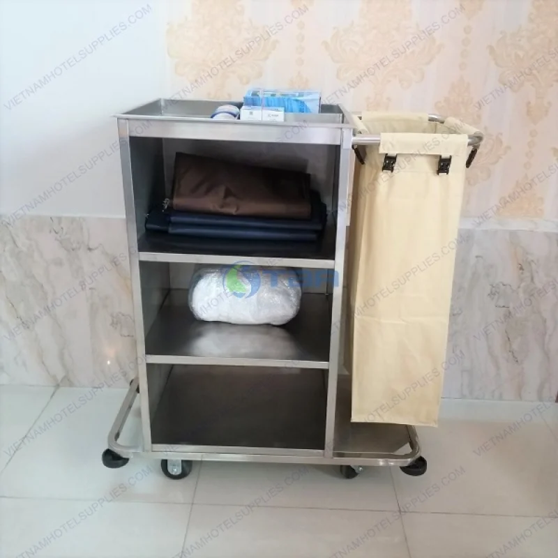 - Xe làm vệ sinh buồng phòng inox có thiết kế đa năng kết hợp 2 trong 1 có thể vừa vận chuyển đồ sạch phục vụ buồng phòng đồng thời thu dọn vệ sinh buồng phòng một cách nhanh chóng, hiệu quả nhất.